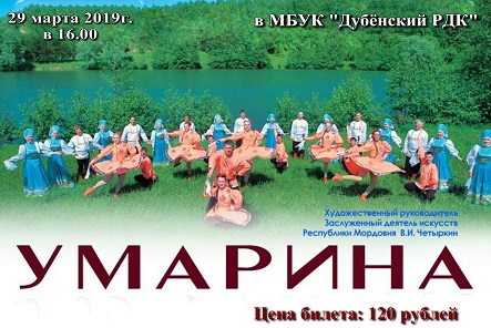 29 марта Концерт Мордовского Государственного Ансамбля Песни и Танца "Умарина" на сцене МБУК "Дубёнский РДК" в 16.00 Цена билета: 120 рублей