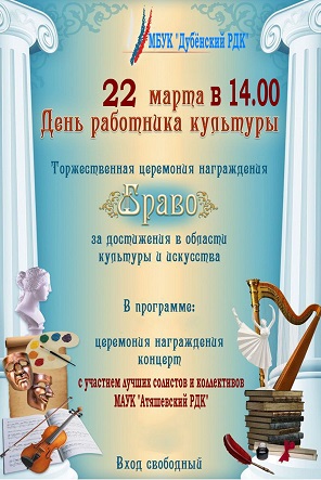 22 марта в 14.00 в МБУК "Дубенский РДК" концерт, посвященный Дню работника культуры с участием лучших солистов и коллективов МАУК "Атяшевский РДК". Вход свободный.