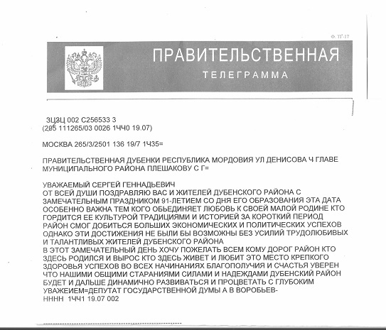 Правительственная телеграмма — Дубенский муниципальный район