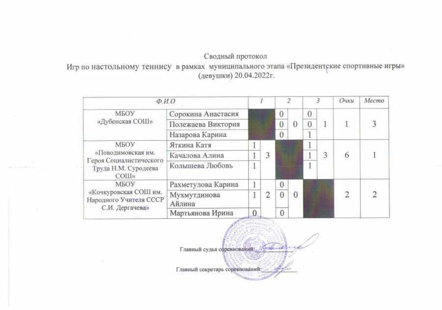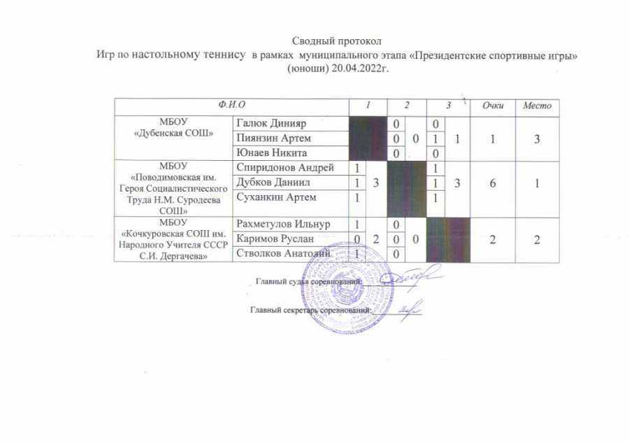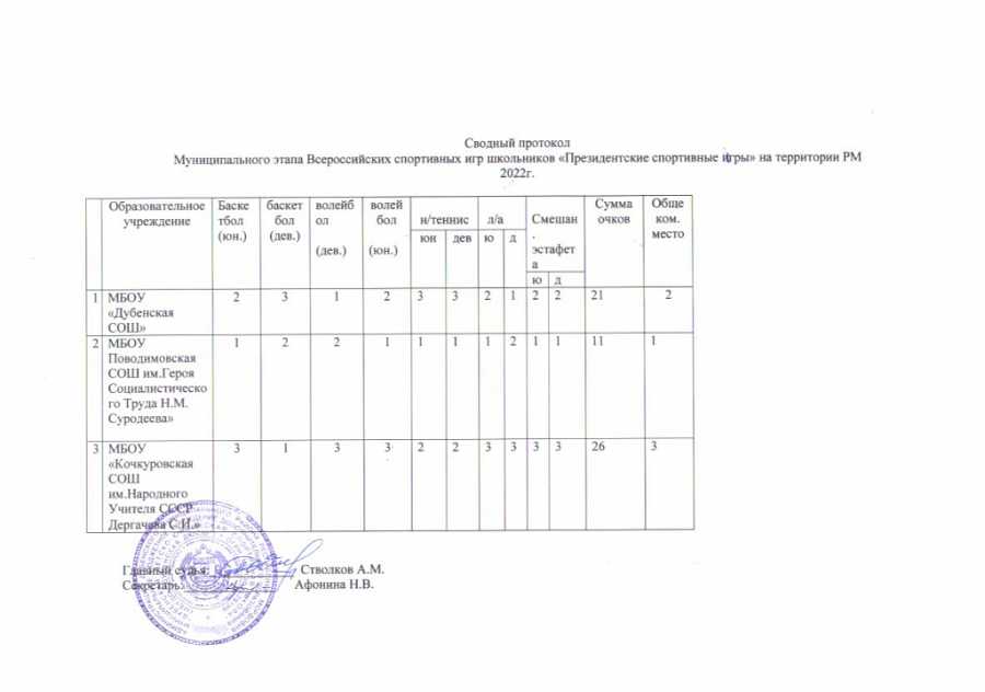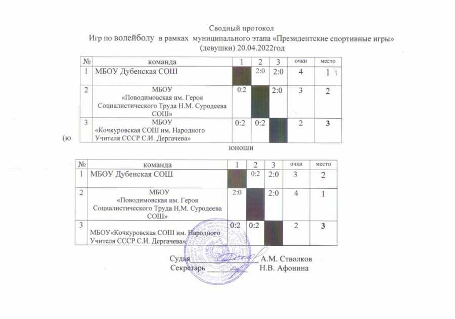 20.04.2022 на базе МБУДО "Дубенская ДЮСШ" проведен муниципальный этап Всероссийских спортивных игр школьников "Президентские спортивные игры" . Приняли участие команды общеобразовательных школ района. На первом месте команда Поводимовская СОШ имени героя социалистического труда Н.М.Суродеева , Второе место Дубенская СОШ , третье место Кочкуровская СОШ имени народного учителя СССР С.И. Дергачева. Команда победитель примет участие в зональном этапе игр.