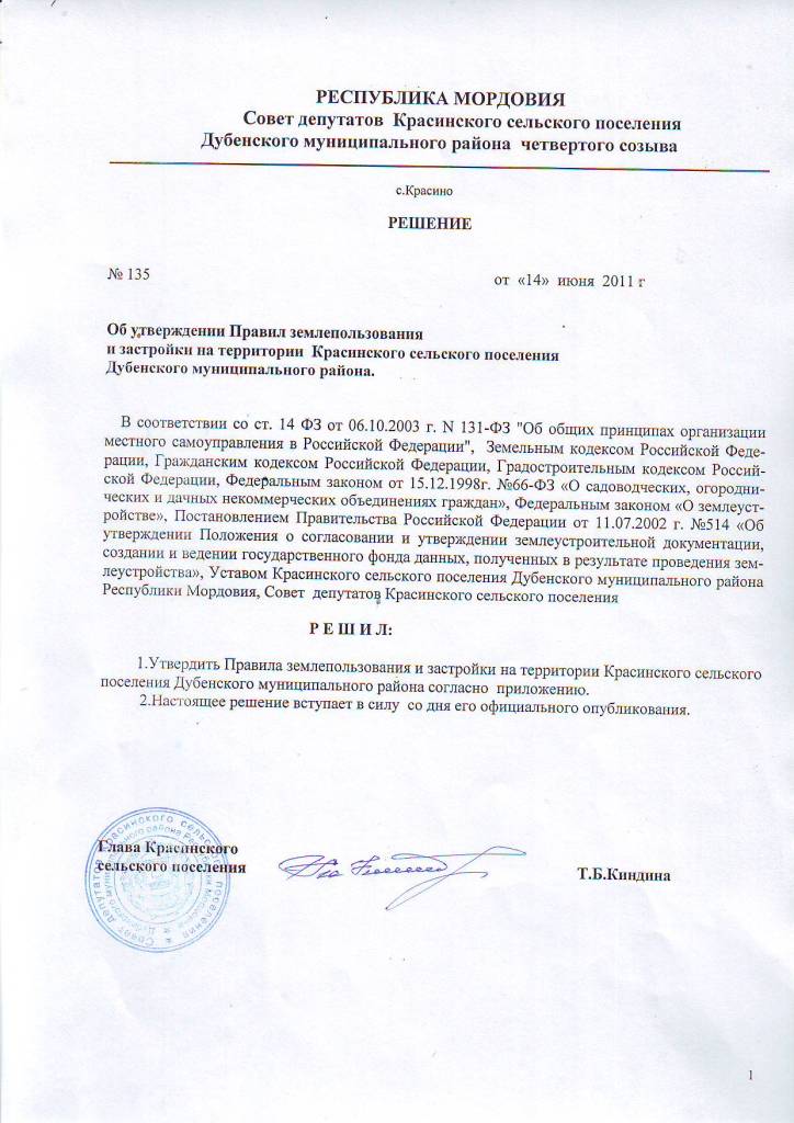 Решение об утверждении ПЗЗ Красинского сельского поселения. — Дубенский муниципальный район