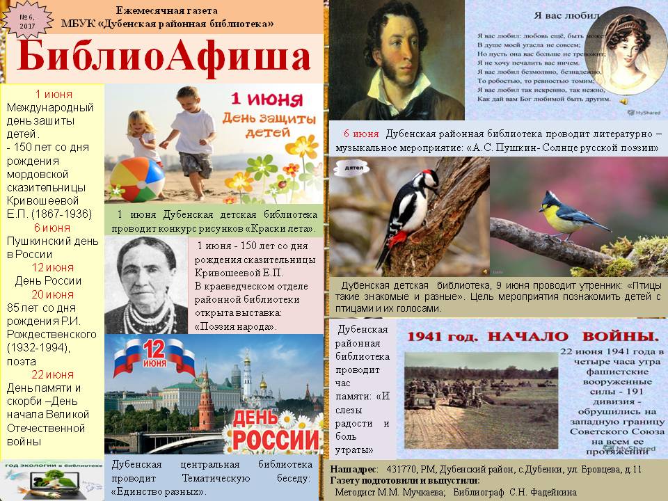 БиблиоАфиша на июнь 2017 год. — Дубенский муниципальный район