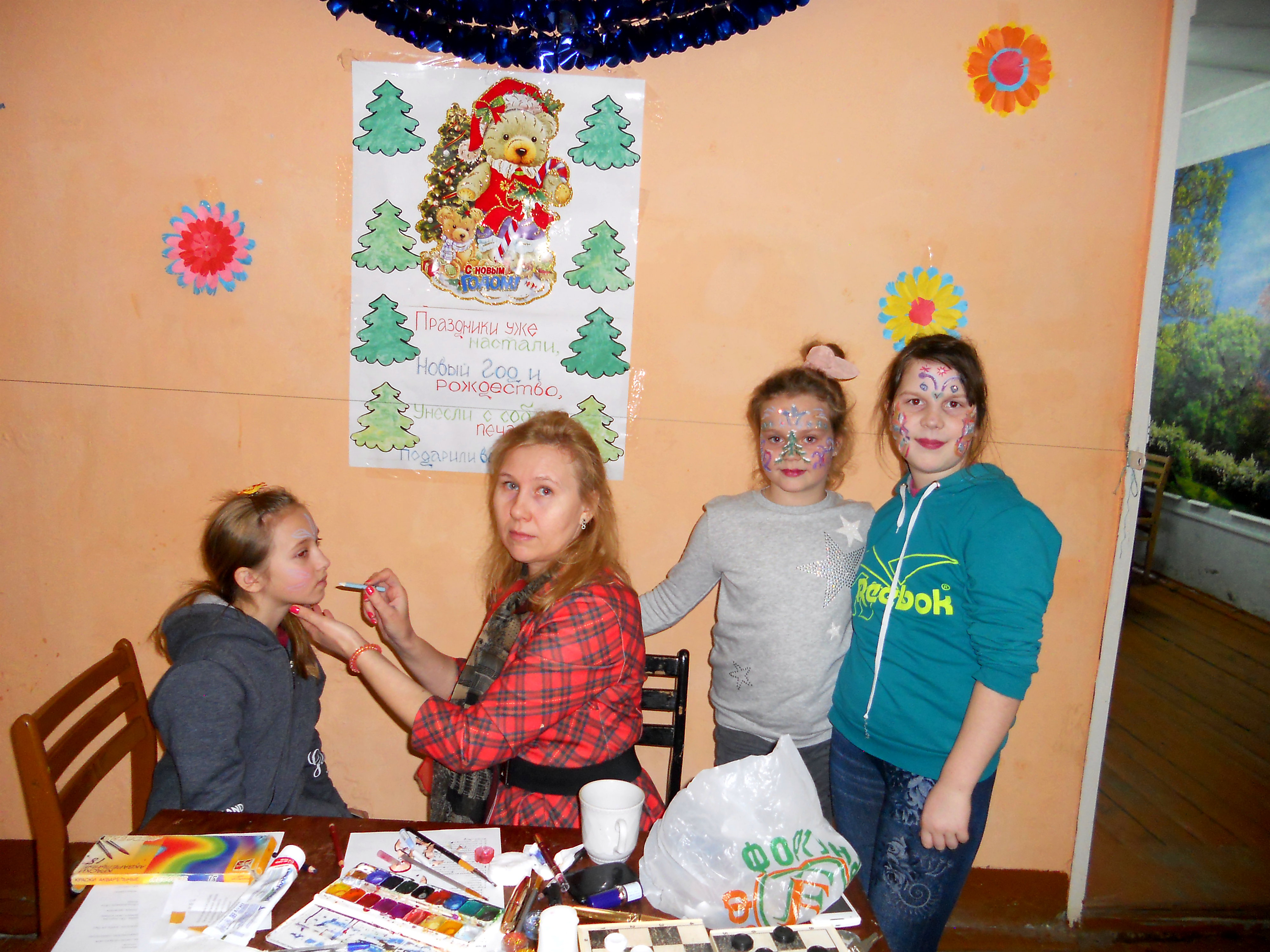 Ребята смогли блеснуть своими талантами и соревновались в знании сказок, стихов и песен. В конце мероприятия всем желающим нарисовали новогодний аквагримм.